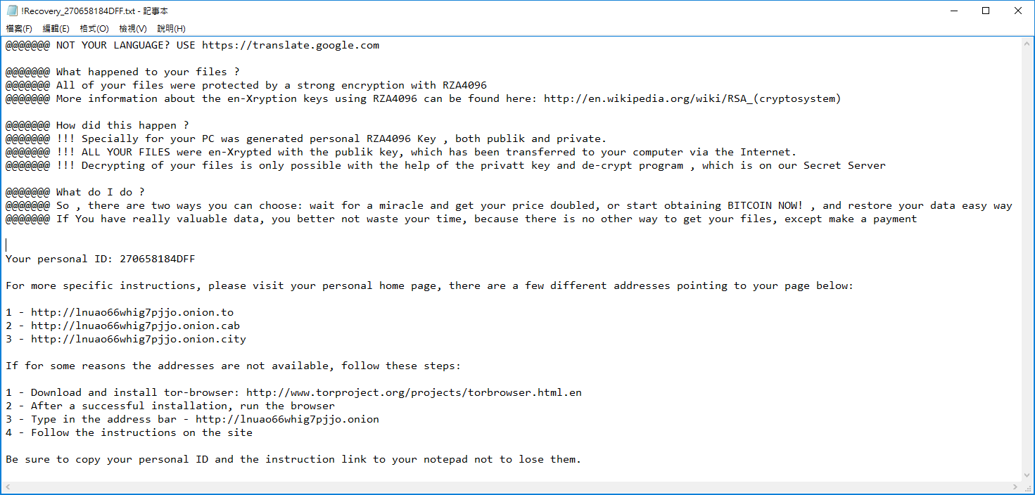 由訊息可得知勒索方採用 RSA-4096 做加密,並要求使用者下載 Tor Browser 並進入指定網址使用比特幣給付贖金。